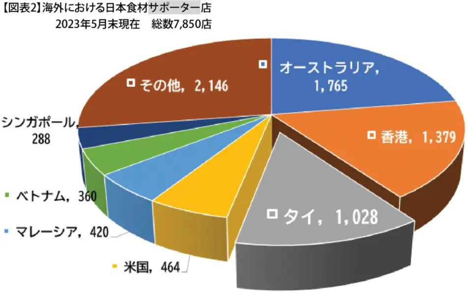 タイ 日本産食材サポーター店舗数3位に! こうした日本食ブームを背景に、海外で日本産食材を扱う飲食店や小売店を「日本産食材サポーター店」として認定する制度を農林水産省は2016年にスタートした。飲食店の場合、「日本産食材を使用した料理を常に提供」「食材が日本産であることをメニューなどで説明」「接客時に日本産の魅力や特徴をPRする」などの条件を満たすとサポーター店として認定される。サポーター店は2016年度末172店舗から2023年5月末7,850店舗と7年ほどで45倍以上に増えている。タイは、オーストラリア、香港に続いて第3位の店舗数となっている。日本産食材の魅力を発信する海外拠点として、農畜産物の輸出拡大にも期待がかかる(図表2)。
