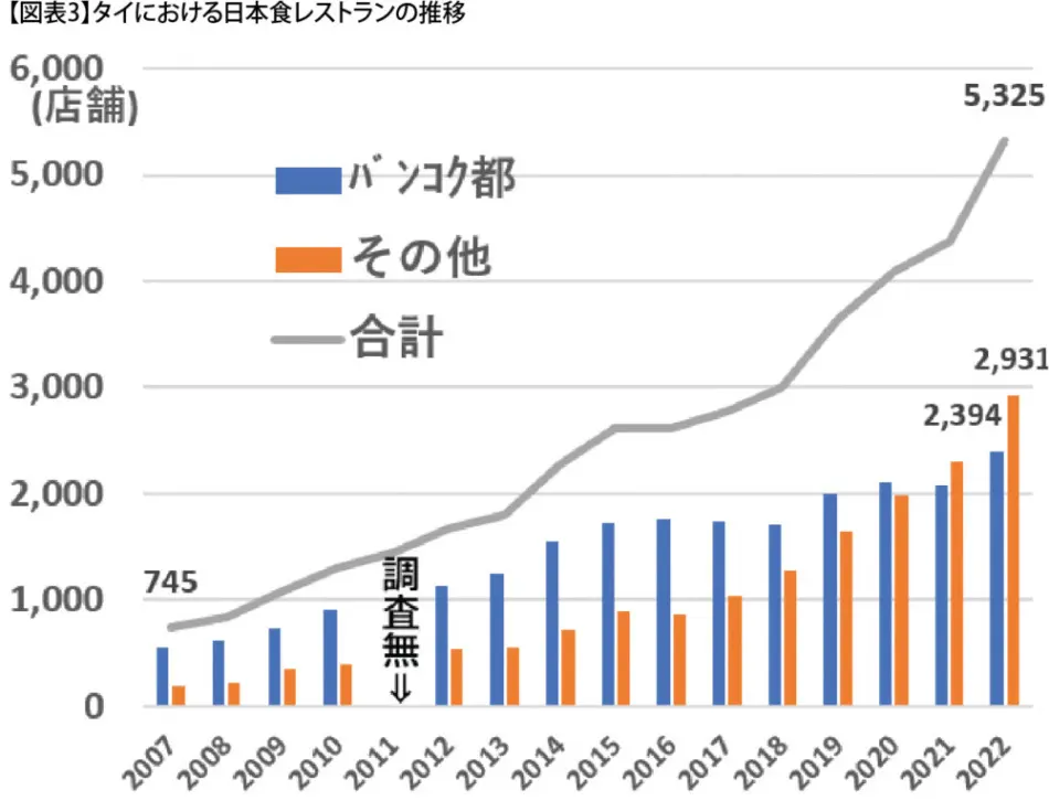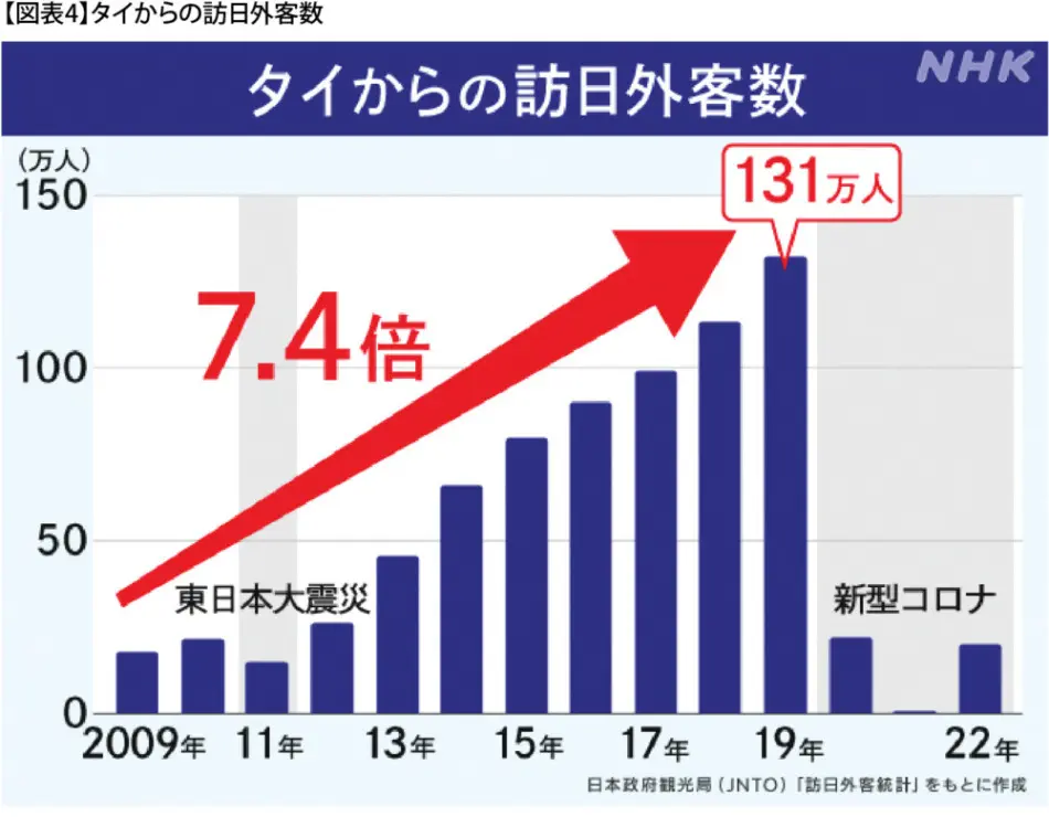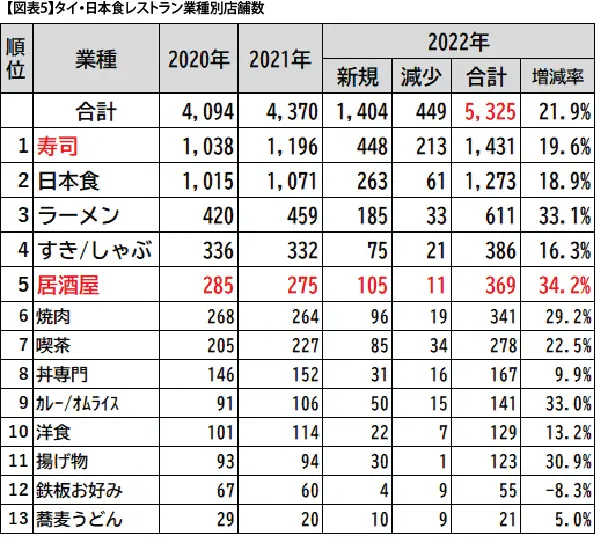 タイの日本食レストランが5,000店舗突破! タイで日本食レストランが人気だ。日本貿易振興機構(ジェトロ)によると、2022年は5,325店(前年比21.9%増)と、統計を開始した2007年以降で最多となった。経済成長で所得水準が向上し、日本食材への需要が高まっている(図表3)。業種別で最も多かったのが寿司で1,431店舗、日本食(日本料理全般など)が1,273店舗と続く(図表5)。 タイで、ここまで日本食が人気となっている背景には、経済成長で生活が豊かになり、旅行や外食にお金をかけられるようになった中間層の存在がある。日本に来るタイ人は、2019年には、10年前のおよそ7倍の131万人を超えた(図表4)。7割はリピーターという。かつての日本食市場は、タイ進出の日本企業の日本人駐在員などをターゲットにしたものであった。現在は、日本へ旅行したタイ人によって本物の日本食にニーズが高まっている。