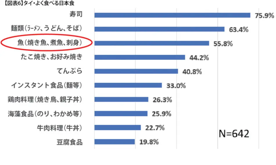 タイ人は魚料理が好き?! 2022年の日本食レストランの新規店舗は、1,404店舗でほぼ全てのカテゴリーで増加したが、昨年度に続き、寿司、日本食、ラーメンの新規店舗が目立つ。一方、コロナの影響で店舗数が減少していた居酒屋であるが、2022年の店舗数増加率は、34.2%と最も高い(図表5)。これは、バンコク近郊や地方での出店が大幅に伸びたことに起因する。 ところで、タイやインドネシア、香港、台湾などで日本のトレンドや観光情報などを発信してる「FUN!JAPAN」が行った調査によると、タイ人が好きな料理に、何と意外にも3位に「魚料理(焼き魚、煮魚、刺身)」が入っている(図表6)。 このようなこともあり、寿司や日本食、居酒屋などの需要が高くなっていると考えられる。