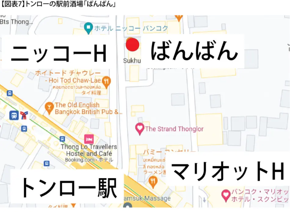 居酒屋「ばんばん」がトンローにオープン あぱまん情報のTWY社の顧客である㈱バズバズキッチン(金沢市)がトンローに駅前酒場「ばんばん」を今年7月オープンした。場所はトンロー駅前のホテルニッコーバンコクの反対側のトンロー通りに面している3階建店舗である(図表7)。 現在、同社は石川県金沢市を中心に炭焼き・手羽先唐揚げ・串焼きなど居酒屋を複数運営しているが、バンコクの居酒屋需要が高いと見込み今回出店したという。 このように新たに開業しようとしている日本食レストランは多く、2023年はさらに出店数の拡大が予測される。