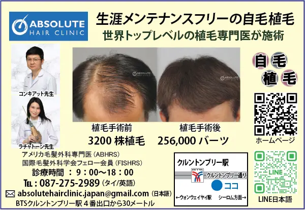 ³: [タイ バンコク 自毛植毛 アブソリュートヘアークリニック](https://absolutehairclinic.com/ja/)