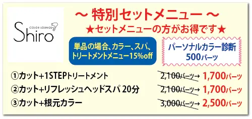 スクムビット・ソイ39のソイ・プロムシーにある「シロカラーラウンジ(Shiro Color Lounge)」では、特別セットメニューを実施中。カットと1ステップトリートメントが通常2,100バーツが1,700バーツ。カットとリフレッシュヘッドスパ20分が通常2,100バーツが1,700バーツ。カットと根元カラーが通常3,000バーツが2,500バーツです。パーソナルカラー診断が500バーツで出来るので、ぜひお試しください。
