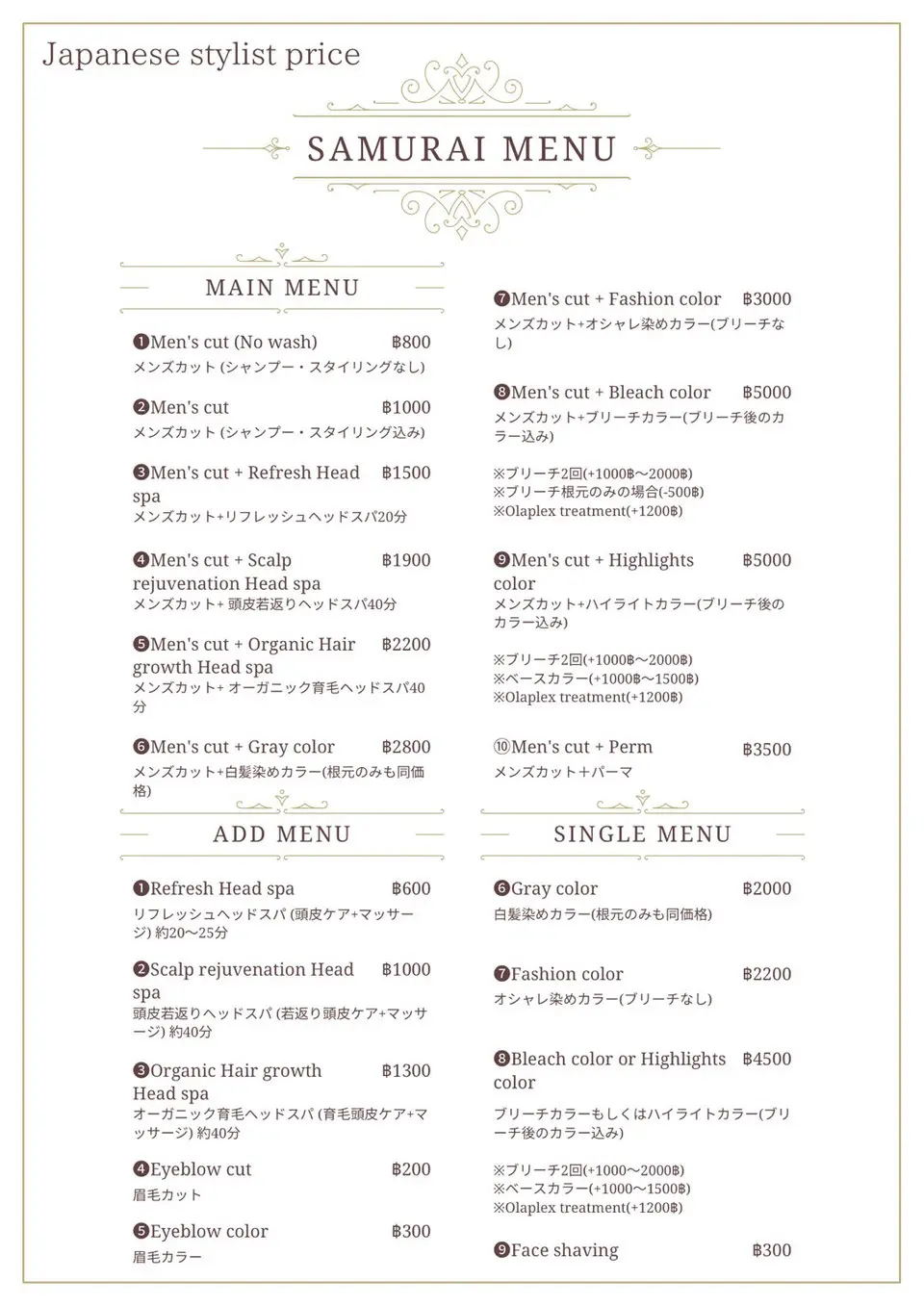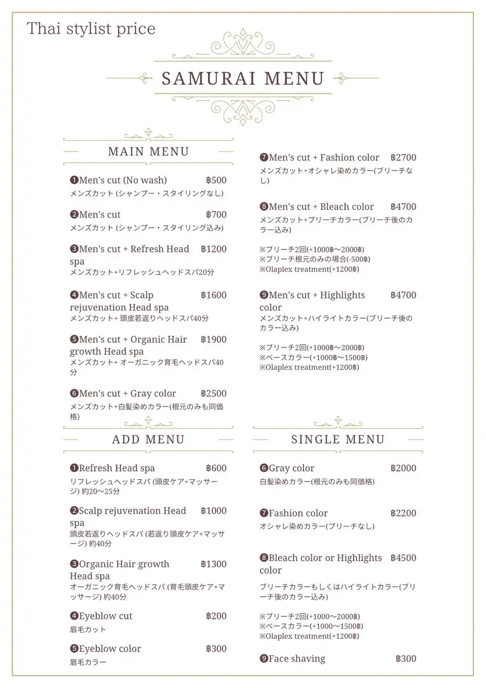 一方、メンズヘアサロン「侍(SAMURAI)」では、タイ人スタイリストによるメンズカットが500バーツ(シャンプーなし)、シャンプー・スタイリング込みなら700バーツとなっています。刈り上げスタイルが得意なので、ぜひお試しください。