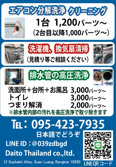 そのほか、排水管の高圧洗浄も得意としており、つまり解消は2,000バーツ~、トイレは3,000バーツ~、洗面所+台所+お風呂の3ヵ所セットが3,000バーツ~となっています。