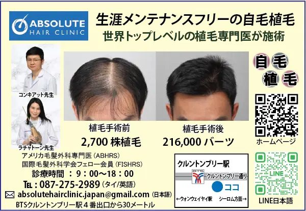 ³: [タイ バンコク 自毛植毛 アブソリュートヘアークリニック](https://absolutehairclinic.com/ja/)