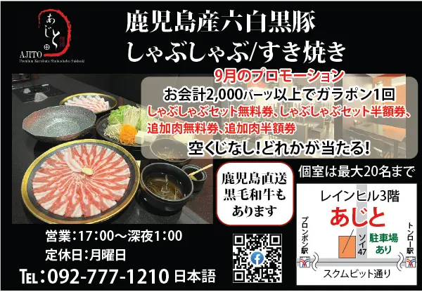 「あじと」という店は、バンコクのスクムビット・ソイ47のレインヒル3階にあります。鹿児島産の六白黒豚と黒毛和牛を使用したしゃぶしゃぶや、鹿児島県産黒毛和牛を使ったすき焼きが食べられるお店です¹²。店内には2人席から4人席が40席ほどあり、6人部屋の個室が2部屋と4人部屋が1部屋あります。予約や問い合わせは日本語で受け付けています¹。