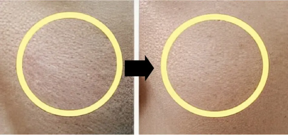 表皮と真皮の状態を内部から回復させることで、皮膚にハリや弾力、厚みが増し、刻まれたしわを改善します。目のまわりなど、薄くなった皮膚のハリを改善して、額・眉間・首などに刻まれたしわを目立たなくします。さらに肌の水分保持力の改善やコラーゲン・弾性繊維の再合成促進に効果があります。