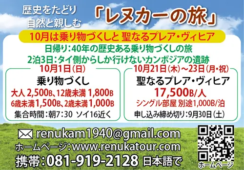バンコク発で楽しいツアーを催行している「レヌカーの旅」では、10月21日(土)の朝から23日(月)にかけて、3連休に聖なるプレア・ヴィヒア遺跡へ行きます。旅程は21日にクメール領に入り、その夜はプレア・ヴィヒア泊、22日にプレア・ヴィヒアを見学してタイ領に入り、23日午前中にバンコクに到着です。