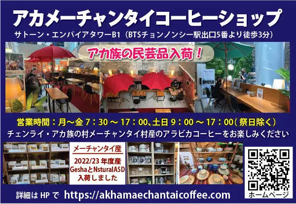「アカ・メーチャンタイ・コーヒーショップ」は、タイ北部チェンライにあるアカ族のメーチャンタイ村のコーヒー豆のみを使用しているコーヒーショップです。店舗は、バンコクのビジネス街中心部サトーンに位置するエンパイアタワーの地下1階にあります¹。また、同店舗は日本のNPOアジア自立支援機構が共同運営しており、収益の半分はメーチャンタイ村の経済、環境保全、社会福祉事業に寄贈され、残りの半分はアジア自立支援機構を通じてタイの食品ロス撲滅事業や貧困・格差解消や環境保護事業等の支援にあてることを目指しています²。