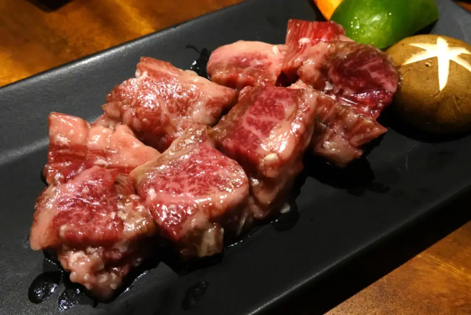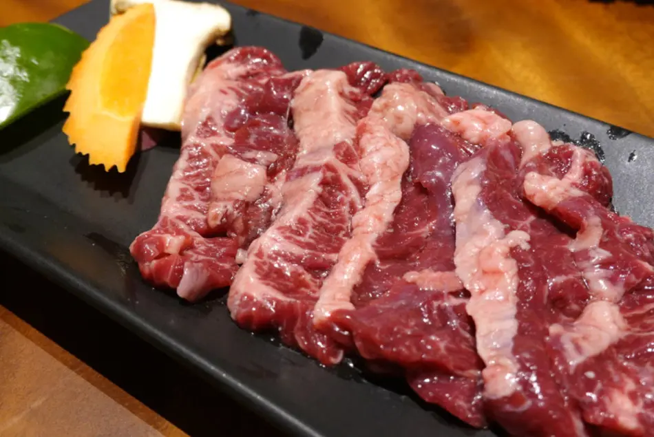 ほかにも、広島県のみで食べられている希少部位のコウネがいただけます。コウネは歯ごたえのある甘い脂身を楽しむ肉ということもあり、白い脂身の部分が多いのが特徴です。そのため、焼いている時にその脂身の脂が滴り落ちることで炎が勢いづき、コウネの脂身がじわじわと焼かれていくので、ついついじっと見てしまいますが、薄くスライスされているので焦げないように注意してください。甘い脂身を堪能するために塩でいただくことがおすすめです。