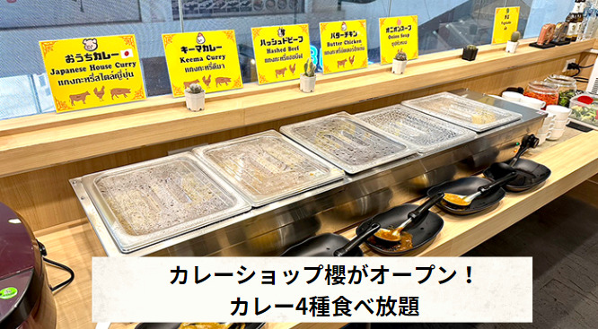 カレーショップ櫻は、バンコクのフジスーパー2号店2階にある日本のカレー食べ放題の店です¹。4種類のカレーが食べ放題で、スープや副菜もあります¹。料金は男性220バーツ、女性・子ども180バーツ、幼児80バーツです¹。営業時間は昼11時30分~夜21時までですが、食材がなくなり次第終了です¹。日本の「おうちカレー」やキーマカレーなど、懐かしい味のカレーが楽しめます¹。