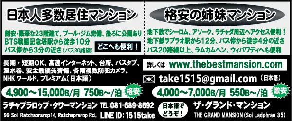 (4) 日本語OKの格安アパート、ラチャプラロップマンションとザ・グランドマンション | タイ バンコク タイ自由ランド. https://jiyuland5.com/%e3%83%a9%e3%83%81%e3%83%a3%e3%83%97%e3%83%a9%e3%83%ad%e3%83%83%e3%83%97%e3%81%a8%e3%82%b0%e3%83%a9%e3%83%b3%e3%83%89%e3%83%9e%e3%83%b3%e3%82%b7%e3%83%a7%e3%83%b3/.