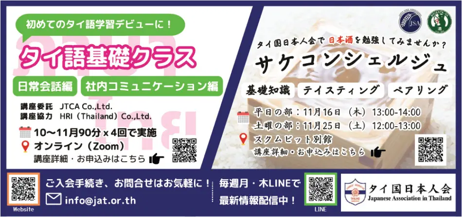 タイ国日本人会では、10月から11月にかけて好評のタイ語基礎クラスを再び開講します。