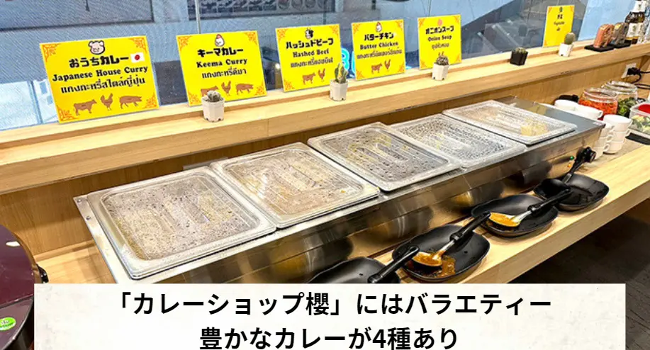 カレーショップ櫻は、バンコクのフジスーパー2号店2階にある日本のカレー食べ放題の店です¹。4種類のカレーが食べ放題で、スープや副菜もあります¹。料金は男性220バーツ、女性・子ども180バーツ、幼児80バーツです¹。営業時間は昼11時30分~夜21時までですが、食材がなくなり次第終了です¹。日本の「おうちカレー」やキーマカレーなど、懐かしい味のカレーが楽しめます¹。
