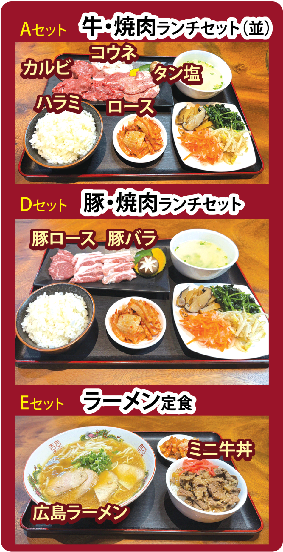 「お好み焼 広島」の姉妹店である「焼肉 広島」では、昼からお得に焼肉がいただけるランチセットがAからEの5種類あります。