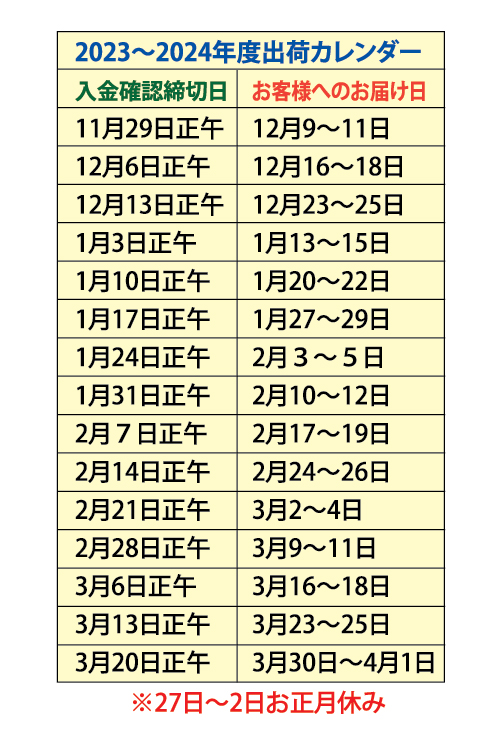 申込み締め切り日と日本へのお届け日については、下の表を参照してください。下記広告内の価格は日本での宅配料金も含まれており、指定の住所へお届けいたします。