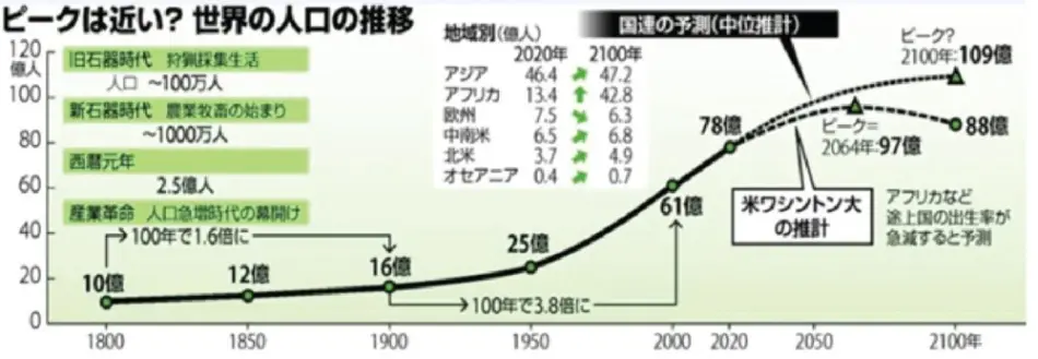 国連人口基金によると、世界の総人口が推計で80億人を突破したと公表(2022/11/15)。2011年に70億人を超えてから、11年間で10億人増えた。国連は急激な人口増加が社会経済発展の負担になっているとして、各国に警鐘を鳴らしてる(JIJI.com2022/11/15)。 一方、「人類は今世紀中に減り始め、もう増えることはない。」と人口学者は予測している(日経2023/6/28)。国連はもともと、2100年まで人口は増え続けるという推計を出していた(2019/7)。 しかし、国連の予測は出生率低下をきちんと織り込んでいないのではないかという批判があり、米ワシントン大の研究者が2064年の97億人をピークに減少するという推計を2020年7月に公表した(図表1)。2040年には89億人前後となっているであろう。