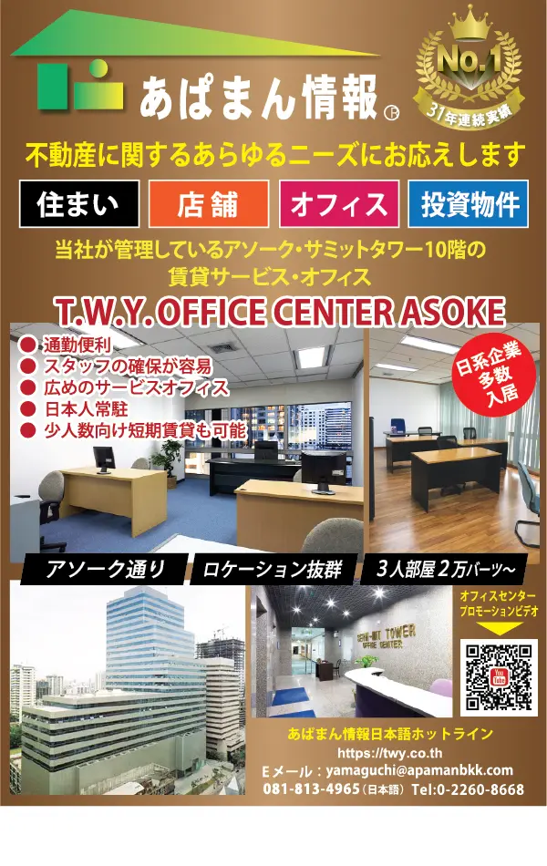 バンコクで31年の経験と実績を持つあぱまん情報。住まいから店舗・オフィス・投資物件まで、お客様の幅広いニーズにお応えしています。 同社が管理している賃貸サービスオフィス「TWY OFFICE CENTER ASOKE」は、ビジネス街で日系企業が集まるアソークのサーミットタワー10階にあります。 少人数向け短期賃貸も可能なので、少人数でのスタートアップにも便利です。セキュリティーも万全で、日系企業のほかに日本の総合大学3校が窓口を設置しております。BTSアソーク駅、地下鉄スクムビット駅の2駅が使えるという通勤が便利なロケーションで、従業員の確保がし易いという利点もあります。 下の広告内のQRコードから、「TWY OFFICE CENTER ASOKE」のプロモーションビデオをご覧いただけます。ご興味のある方は、お気軽にご連絡ください。