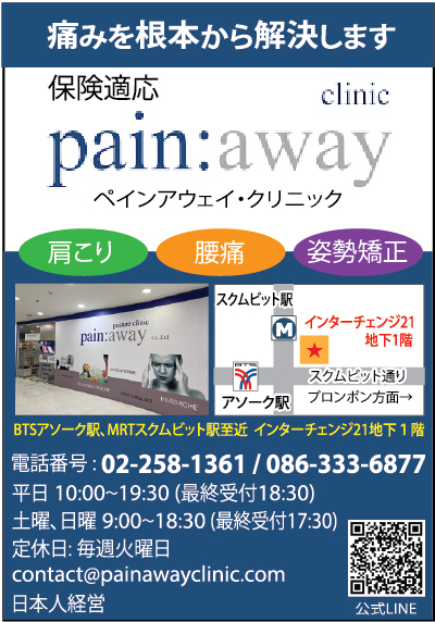 ¹: [ペインアウェイクリニック – バンコクで整体。肩こり、腰痛、カイロプラクティック、骨盤矯正。| BKK](https://www.painawayclinic.com/ja/%E3%83%9B%E3%83%BC%E3%83%A0/)