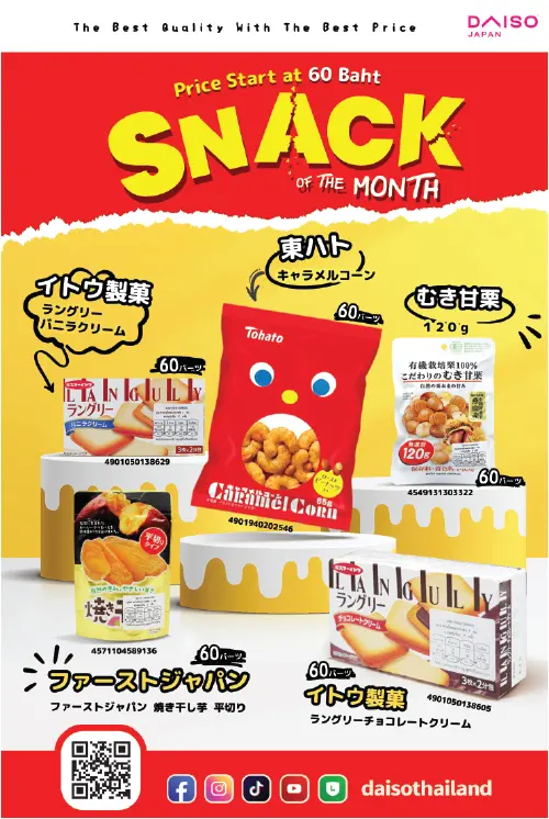 バンコクの賑やかなスクムビット地区、日本人にとってもアクセス抜群のエリアに、日本発の100円ショップ「ダイソー」が彩り豊かな商品を展開しています。一言で言えば、お菓子の宝庫。今、ダイソでは、価格帯60バーツからというリーズナブルながら、味も品質も抜群のスナック類が大集結しているのです。