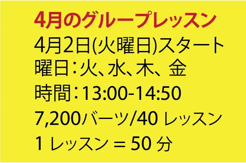4月2日から新しいグループレッスンが始まります。月火水木の週四日。合計40時間(1時間ごとに10分の休憩含む)のレッスンで、授業料は7200バーツとなります。時間は午前10時から11時50分です。興味のある方はスクールまでお問い合わせください。