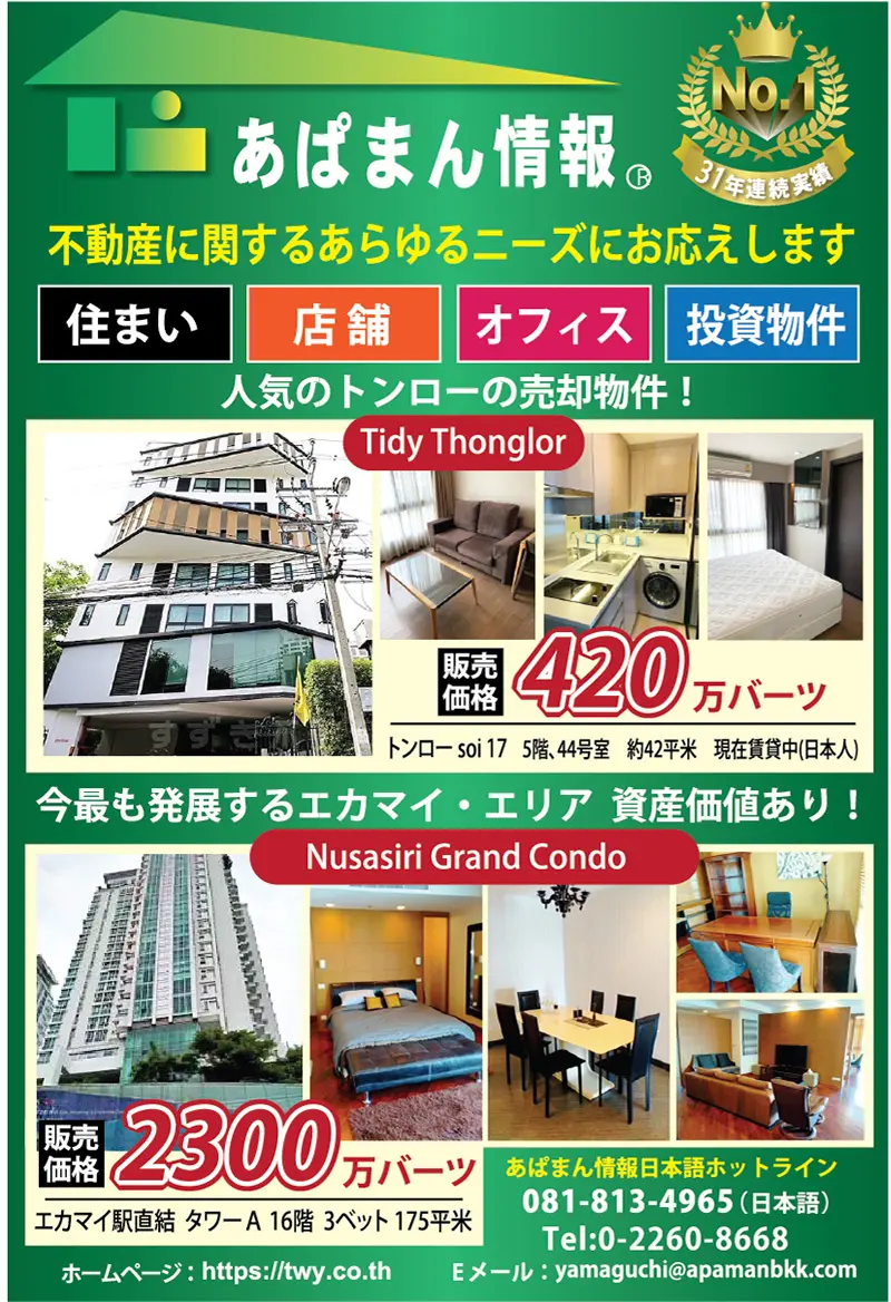 バンコクで31年の経験と実績を持つあぱまん情報。住まいから店舗・オフィス・投資物件まで、お客様の幅広いニーズにお応えしています。バンコクの住まいは、スクムビットエリアを中心とした、コンドミニアムやサービスアパートメントの賃貸及び売却物件のご紹介をしております。 今回、ご紹介する物件は、Nusasiri Grand Condo 販売価格は2300万バーツ。3ベット 175㎡、タワーAの16階の物件です。平米単価20万バーツのエリアで12万代はお手頃。今最も発展するエカマイエリアにある資産価値ありの物件です。ゲートウェイエカマイに隣接しており買い物にも外食にも便利です。 人気のトンローにあるIVY Thonglorは、販売価格1280万バーツ。トンロー25 2ベット86㎡。ご興味のある方は、お気軽にご連絡ください。