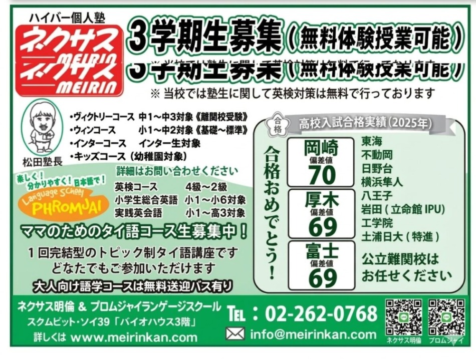 バンコクで差をつける学習塾「ネクサス明倫」-個別指導と英語教育の融合で未来を切り拓く NakamuraMoriyoshi 4時間前 読了時間 1未満 分 画像をクリックで拡大表示 🔗 ネクサス明倫 & プロムジャイ 関連リンク 公式サイト(ネクサス明倫) 塾の詳細、コース案内、最新情報の確認はこちら。 お問い合わせメールを送る 無料体験授業やタイ語講座の申し込み・ご質問はこちら。 電話をかける(タイ国内) 電話番号:02-262-0768 📝 広告の主な内容 学習塾コース: 小学生〜高校生対象(難関校受験・英検対策など) タイ語コース: 「ママのためのタイ語」「大人向け語学講座」 場所: スクムビット・ソイ39「バイオハウス3階」 特典: 大人向け講座は無料送迎バスあり 共有: Facebook で共有 (新しいウィンドウで開きます) Facebook X で共有 (新しいウィンドウで開きます) X