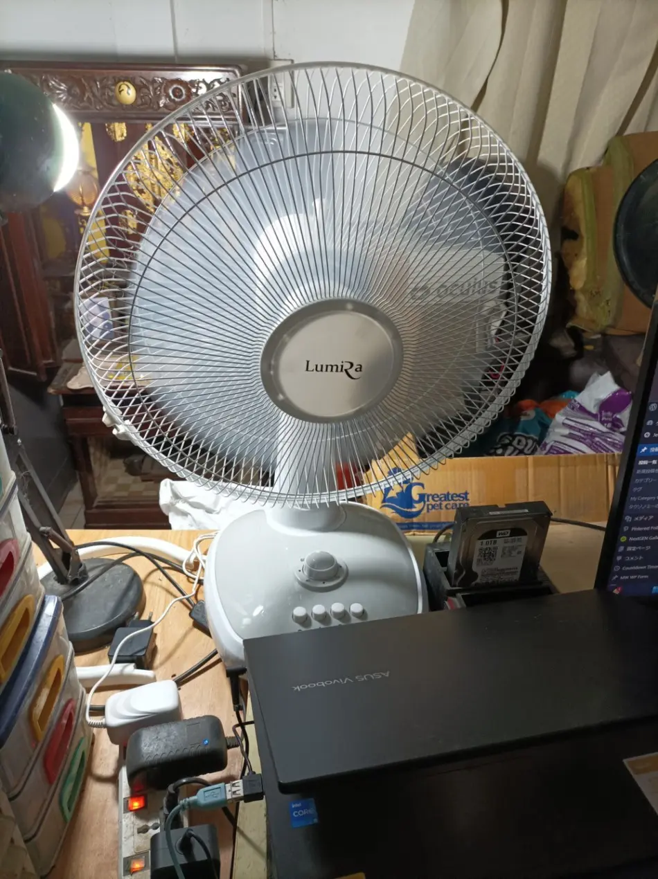 班員は特定できてませんが、ケーブルをかじられて動かなくなってしまいまHした。さっそくとんちゃんが扇風機を注文したのですが普通の扇風機なのであまり効果がありません。しかたがないので、この扇風機で暑い季節をのりこえます。