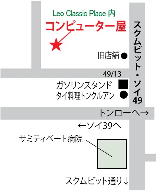 バンコクのスクムビット地区に位置する、日本語でのコンピューター関連相談が可能なトータルコンピューターサービスショップが、便利な立地にて営業を続けています。スクムビット通りからソイ49を進み、サミティベート病院を越えたソイ49/13に位置するレオクラシックプレイス内で、お客様のニーズに合わせた幅広いサービスを提供しております。