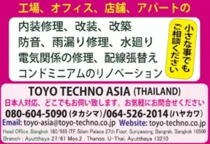トーヨーテクノアジアは、タイにおいて建設、内装工事、配電修理などの幅広いサービスを提供している会社です。特に日本人スタッフが対応するため、サービスの品質や丁寧な対応が評価されています。