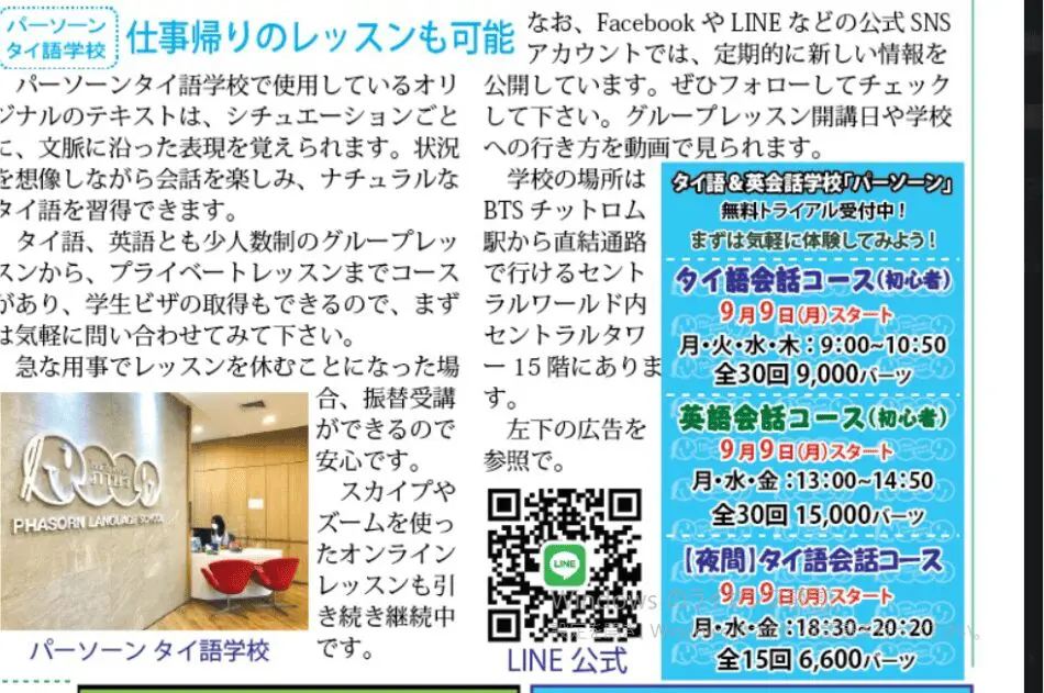パーソーンタイ語学校」は、BTSチットロム駅から直結のセントラルワールド内にあるタイ語・英語学校です。無料体験レッスンを受け付けており、少人数制のグループレッスンやプライベートレッスンなど、幅広いコースを提供しています。また、オンラインレッスンも継続中で、SNSでも最新情報を確認できます。学校では独自のテキストを使用し、自然なタイ語を楽しく習得できます。