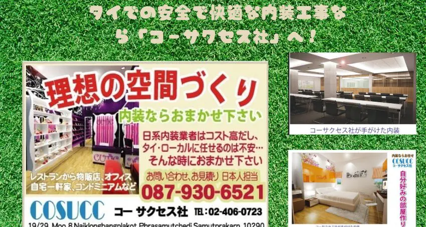 連絡先は、087-930-6521(日本語で対応可能)です。コーサクセス社では、お客様の「欲しいもの」を供給することをモットーに、質の高い内装工事を提供しています。タイでの快適な生活空間を実現するために、ぜひ私たちにお任せください。