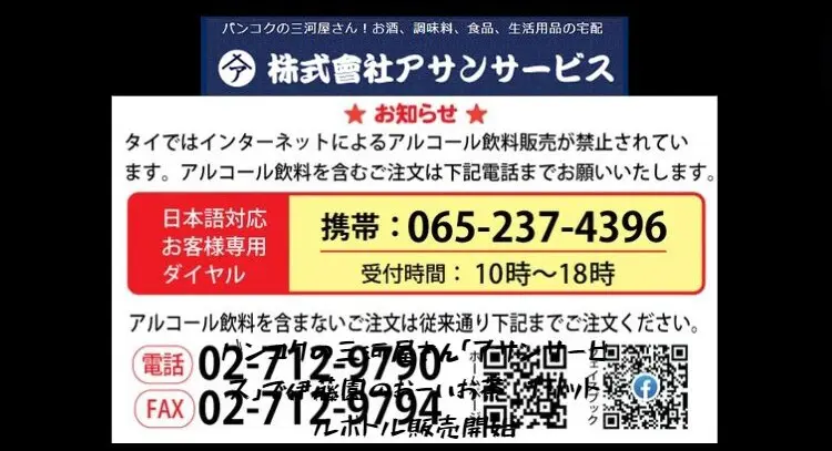 特にアルコール飲料のご注文については、2020年12月7日からタイ政府によるインターネットでのアルコール飲料販売禁止の法律が執行されており、ご注文方法に変更があります。以下の方法でご注文いただけます: