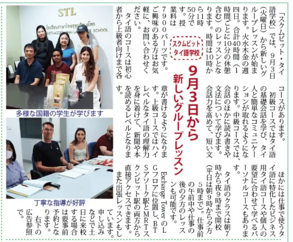 「スクムビット・タイ語学校」で9月3日から新しいグループレッスンが開始。火曜から金曜までの週4日、午前10時から11時50分に行われ、授業料は7900バーツ。初心者から上級者まで、会話力や読み書きが学べる多彩なコースを提供。BTSアソーク駅とMRTスクンビット駅に直結しており、仕事前や仕事後にも通いやすい。ビジネス用タイ語やパーソナルコースもあり、週末の来校は要予約。