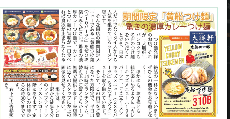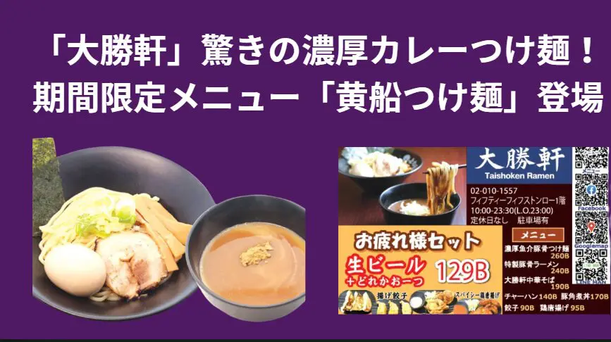 バンコクの人気ラーメン店「大勝軒」が期間限定で「黄船つけ麺」(310バーツ)を提供。濃厚カレーとつけ麺の旨味が絶妙にマッチした一杯です。平日11時~14時のランチタイムには、替え玉またはご飯を無料で提供する特典付き。キッズメニューも充実しており、家族で楽しめるのも魅力。BTSトンロー駅から徒歩5分、年中無休で営業中です。