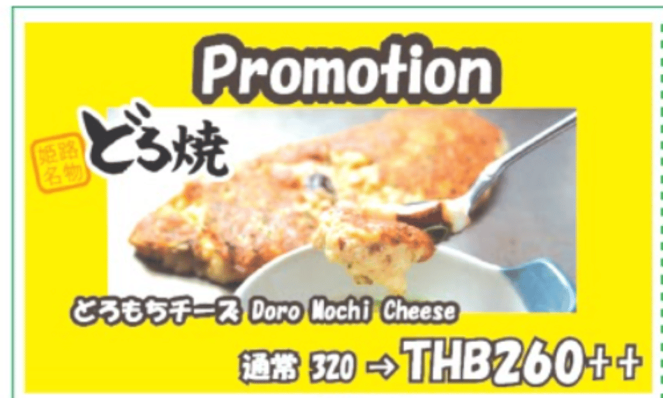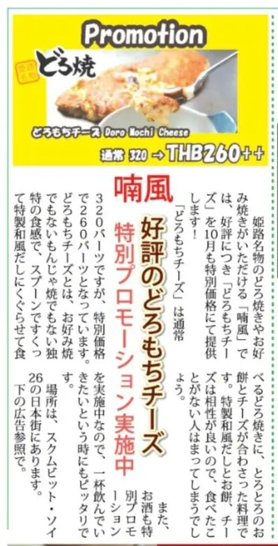 スクンビット・ソイ26の「喃風」では、姫路名物の「どろ焼き」やお好み焼きを楽しめるお店として人気ですが、今月も「どろもちチーズ」を特別価格で提供しています!「どろもちチーズ」は、特製和風だしにくぐらせたとろとろのお餅とチーズが合わさり、絶妙なハーモニーを生み出す一品です。通常価格は320バーツですが、10月中は特別プロモーション価格の260バーツで楽しむことができます。