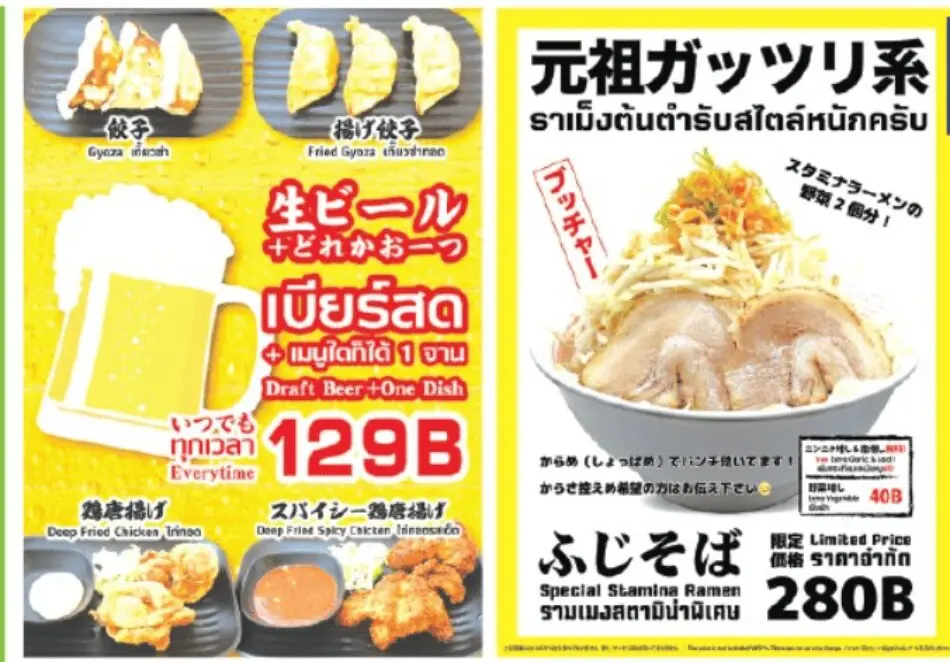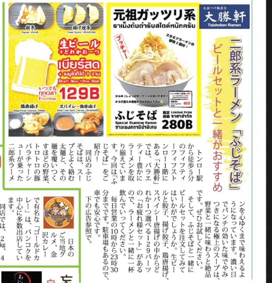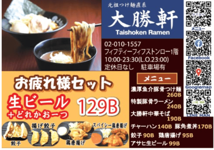 そんな「大勝軒」でのおすすめは、ビールセット!生ビールと揚げ餃子や鶏の唐揚げといったサイドメニューから一品を選べる「お疲れ様セット」が、わずか129バーツで楽しめます。スパイシーな唐揚げや香ばしい揚げ餃子が、ラーメンと抜群に合い、飲んで食べて大満足の時間が過ごせます。