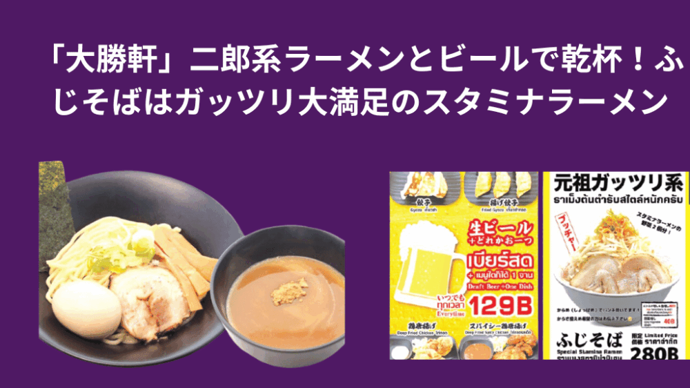バンコクの「大勝軒」では、濃厚なスープと太麺が特徴の二郎系ラーメン「ふじそば」が人気。トンロー駅から徒歩5分で、駐車場も完備しています。おすすめは、生ビールと揚げ餃子や唐揚げが楽しめる「お疲れ様セット」(129バーツ)。スパイシーなサイドメニューがラーメンと絶妙にマッチし、スタミナ満点の食事が楽しめます。10時から23時30分まで営業しており、一日の疲れを吹き飛ばすガッツリ系ラーメン体験が待っています。