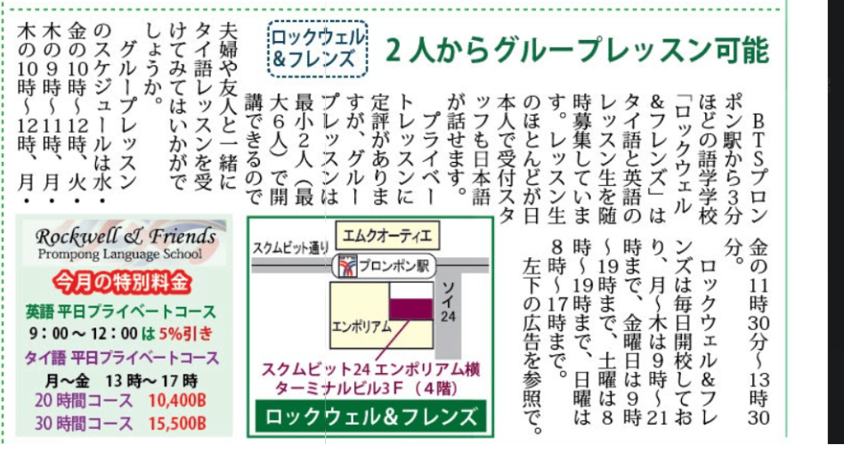 バンコクの**ロックウェル & フレンズ**は、BTSプロンポン駅のすぐ近くにある語学学校です。この学校は、タイ語や英語のレッスンを提供しており、日本人向けにも人気があります。プライベートレッスンやグループレッスンなど、さまざまなコースが用意されています¹²³。タイ語学習を始めるのに便利な場所ですね!