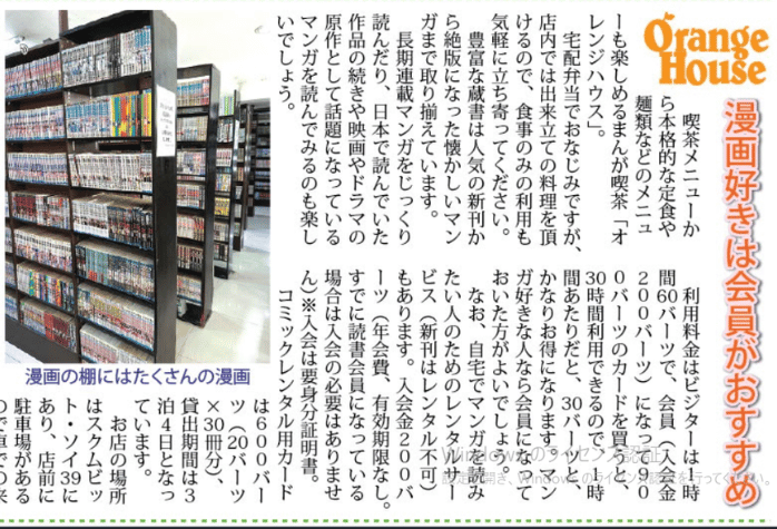店の前には駐車場も完備されており、車での来店にも便利です。漫画と食事の両方を楽しみたい人にとって、「オレンジハウス」は見逃せないスポットです!