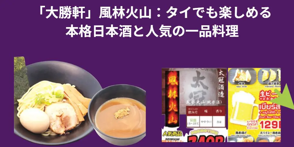 太冠酒造の純米酒「風林火山」は、やや辛口で食事に合う味わいが魅力。常温(15~25°C)で楽しむのがおすすめです。現在、500mlボトルが349バーツで購入可能(数量限定)。揚げ餃子やスパイシーな料理との相性が抜群で、タイのラーメン店でも人気上昇中。また、生ビールと一品料理のセットが129バーツで楽しめるお店もあり、日本酒初心者にもぴったり。食事と共に日本酒の新しい楽しみ方をぜひ体験してみてください!