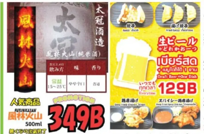 風林火山は、日本酒通の方にはもちろん、日本酒初心者にもおすすめ。特に揚げ餃子やスパイシーな料理との相性が抜群で、日本酒ならではの深みを引き出してくれます。さらに、この日本酒を提供するお店では、生ビールと一品料理のセットが129バーツというお得な価格で楽しめるのもポイントです。