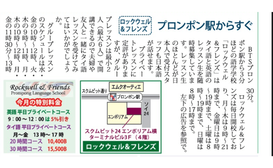 バンコクの**ロックウェル & フレンズ**は、BTSプロンポン駅のすぐ近くにある語学学校です。この学校は、タイ語や英語のレッスンを提供しており、日本人向けにも人気があります。プライベートレッスンやグループレッスンなど、さまざまなコースが用意されています¹²³。タイ語学習を始めるのに便利な場所ですね!
