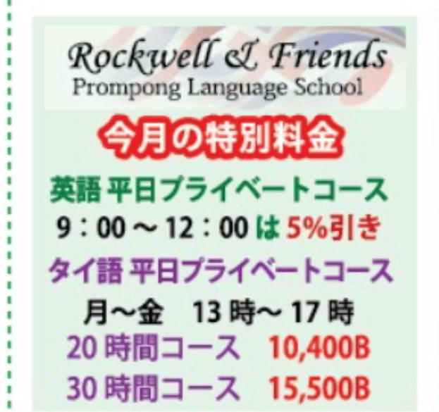 BTSプロンポン駅から徒歩3分の便利なロケーションにある語学学校「ロックウェル&フレンズ」は、タイ語と英語のレッスンを提供。個別指導に定評があり、グループレッスンも少人数制で夫婦や友人同士に最適。日本人が多く、スタッフも日本語対応で安心です。平日午前の英語コースや午後のタイ語コースには今月限定の割引料金が適用中。営業時間は曜日ごとに異なり、土日も開校しているため、柔軟なスケジュールに対応可能。詳細はスクンビット24通りのターミナルビル3階で確認を!