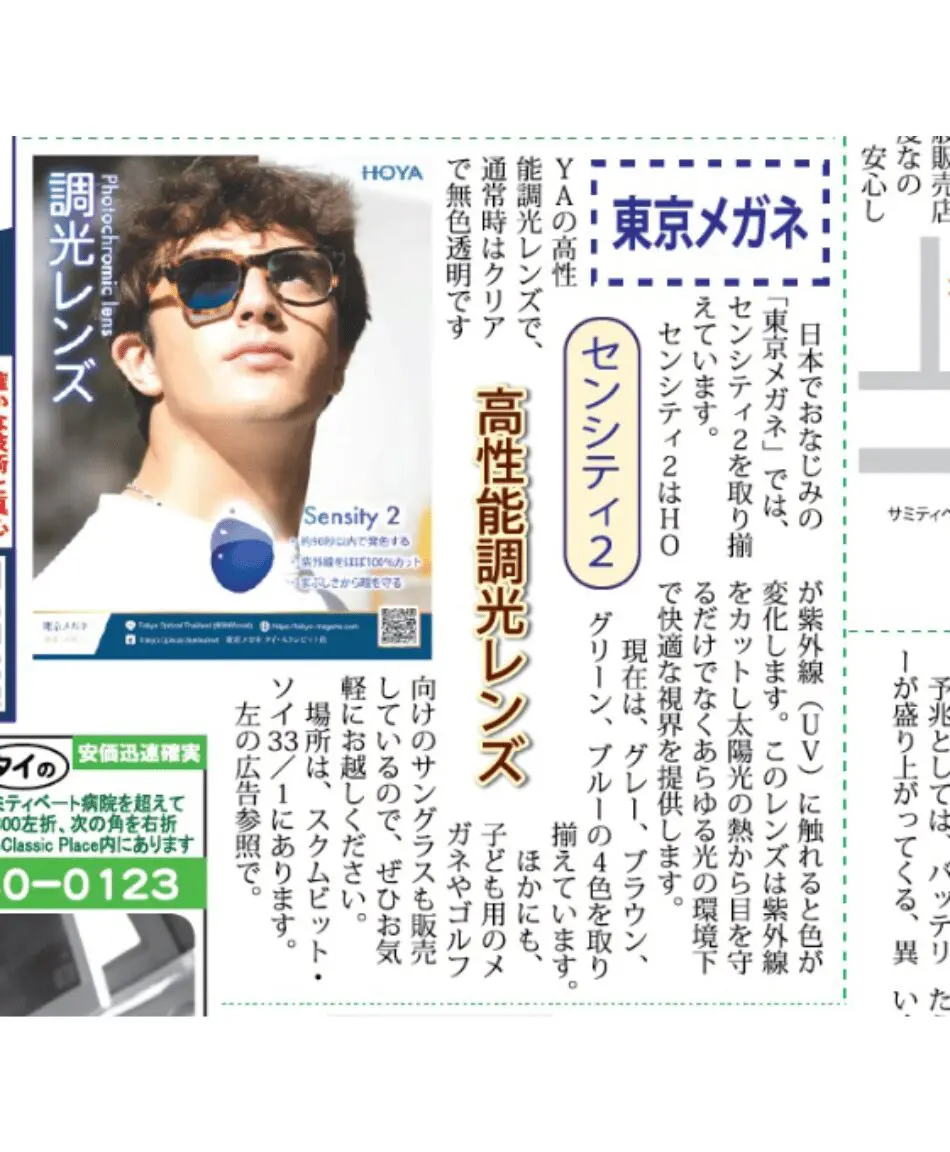 「スクムビット・ソイ33/1にある「東京メガネ」は、日本クオリティの高性能メガネを提供する信頼のショップです。紫外線に反応して色が変わる調光レンズ「センシティ2」は、目を紫外線や太陽光から守りつつ快適な視界を提供します。グレーやブルーなど4色から選べ、子ども用メガネやスポーツ用サングラスも充実。クラシックプレイス内に位置しアクセスも良好。迅速・確実なサービスで視力サポートを行い、タイでの生活をより快適にしてくれます。