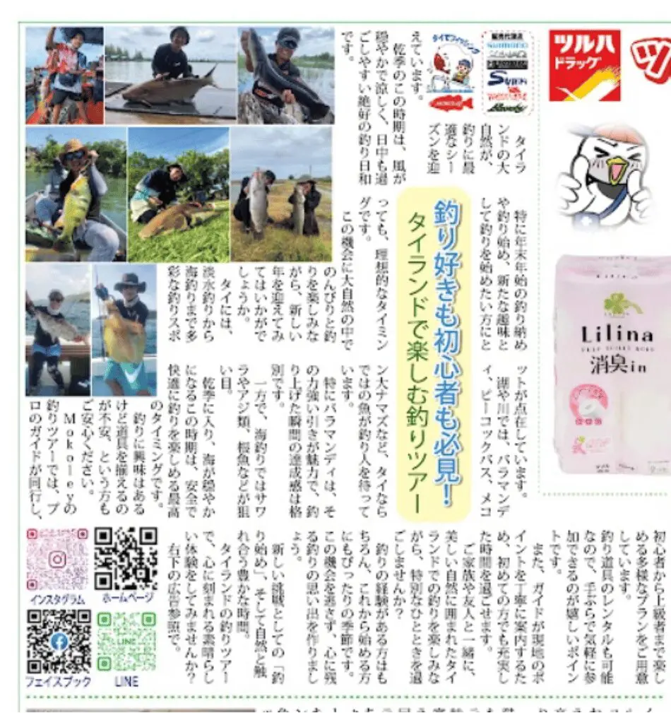 モコリー(Mokoley)は、タイでの釣り体験を提供する人気のツアー会社です。バンコク、パタヤ、プーケットなどから出発する様々な釣りツアーを開催しています。特に、バラマンディやジャイアントスネークヘッド、ピーコックバスなど、タイならではの魚を釣ることができます¹²。