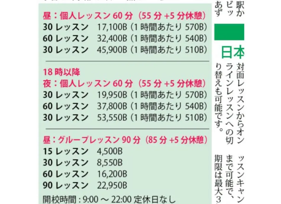 – **学習プラン**: 体験レッスン後に、日本人スタッフが皆様のタイ語レベルに合わせた学習プランを提案します。