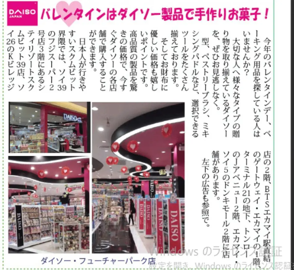 バレンタインデーに手作りスイーツを楽しむなら、ダイソーのベーキング用品がおすすめです。ケーキ型やクッキー型、ペストリーブラシなど、おしゃれで実用的な道具が驚きの価格で手に入ります。スクムビット界隈には、シティリゾートスクムビット39店(ソイ39)、Kビレッジ店(ソイ26)、ゲートウェイ・エカマイ店、ターミナル21店、Jアベニュー店(トンロー)、ドンキモール店(エカマイ・ソイ5)などアクセス便利な店舗が多数。手軽に揃えて特別なバレンタインを!