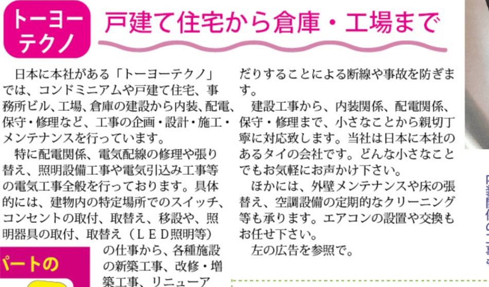 トーヨーテクノアジアは、タイにおいて建設、内装工事、配電修理などの幅広いサービスを提供している会社です。特に日本人スタッフが対応するため、サービスの品質や丁寧な対応が評価されています。