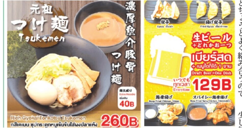 トンロー駅徒歩5分の「大勝軒」は、元祖つけ麺直系の濃厚魚介豚骨つけ麺(260バーツ)が絶品。魚介の旨味たっぷりのスープにもちもちの太麺、自家製チャーシューやまろやかなゆで卵などトッピングもこだわり抜かれています。生ビールと餃子や唐揚げが選べるお得な「ビールセット」(129バーツ)もおすすめ。毎日10時~23時30分営業で駐車場完備、仕事帰りや少し飲みたい時にぴったり。至福の一杯をぜひ堪能してください!